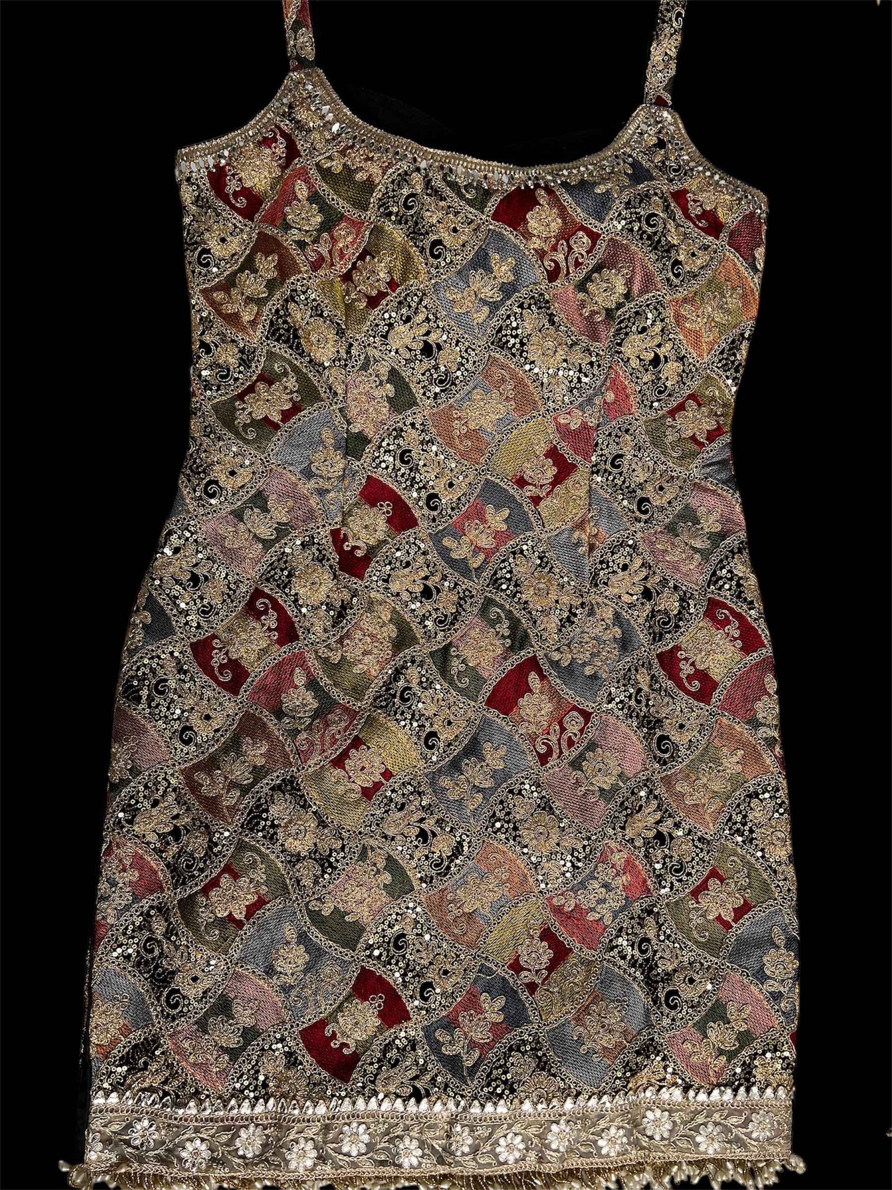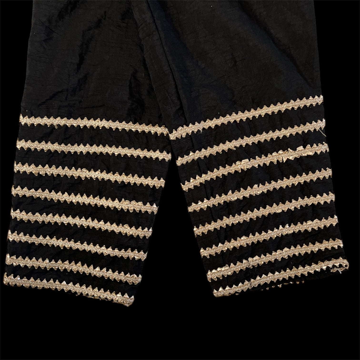 This elegant, multi-coloured trouser suit features exquisite embroidery and delicate lace work on the trousers, paired with a net chunni. Perfect for any occasion, this suit is both stylish and versatile. Elevate your wardrobe with this stunning piece.