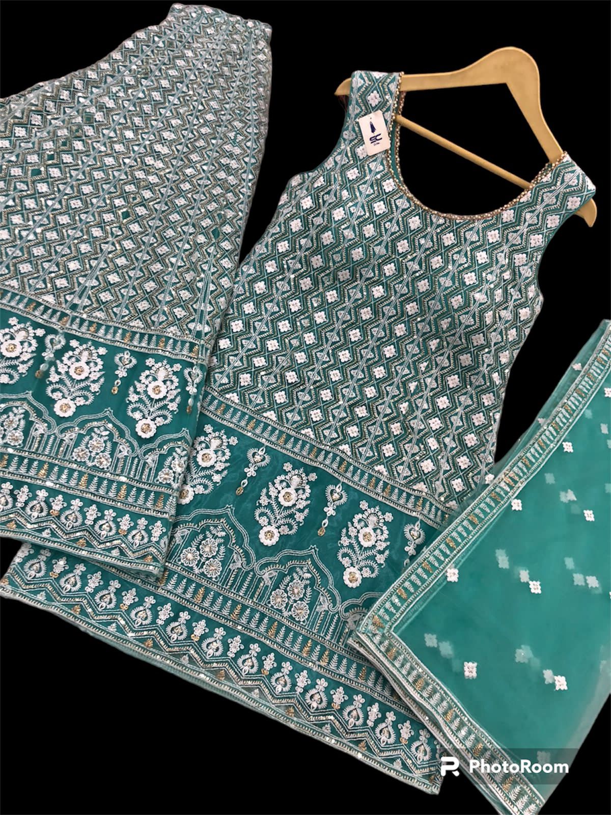 Indulge in luxury with our turquoise Green Net Handwork suit. Featuring elegant white threads of love and intricate embroidery, this designer suit comes with a comfortable plazo and a heavy net dupatta. Elevate your style and make a statement with this exclusive piece.